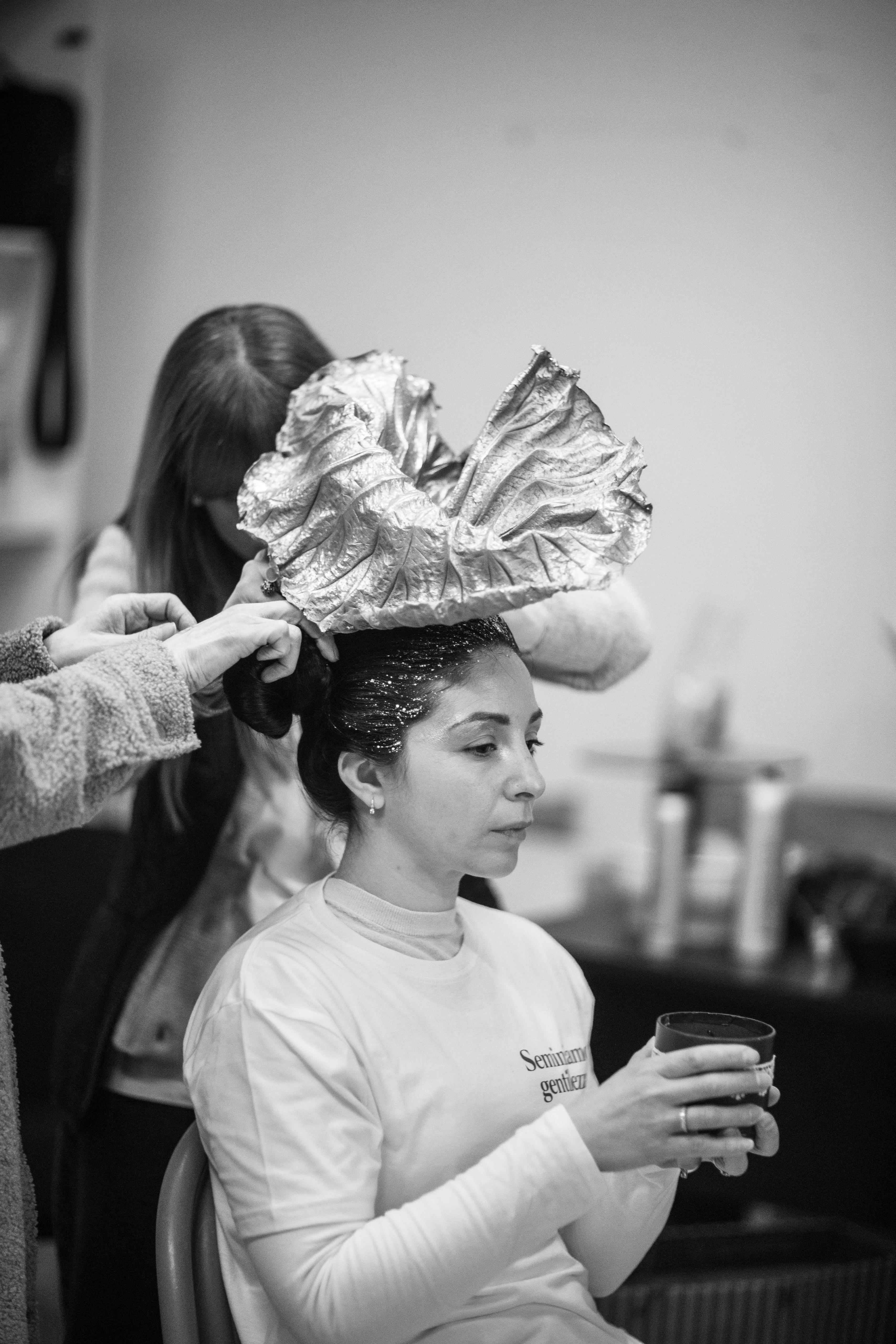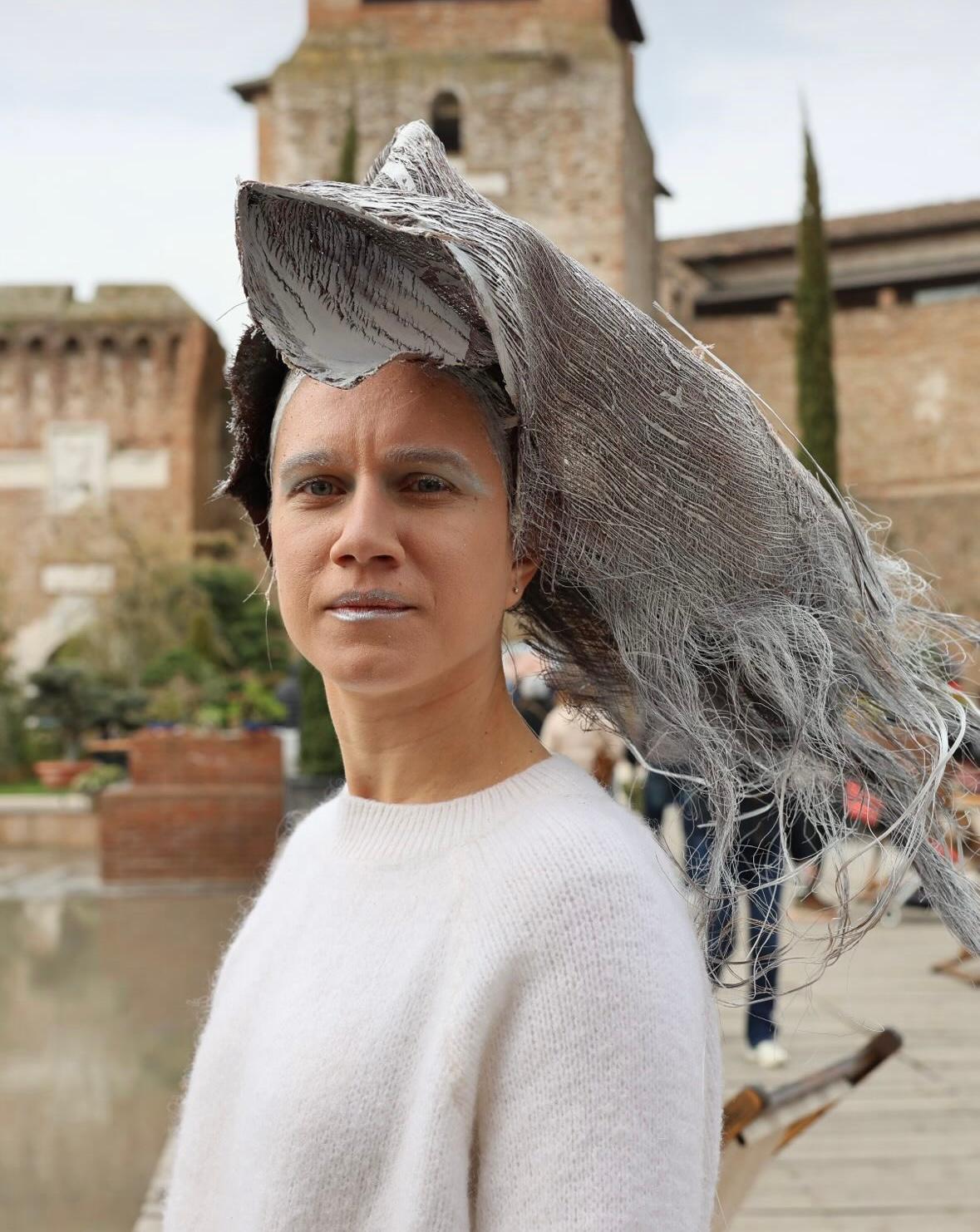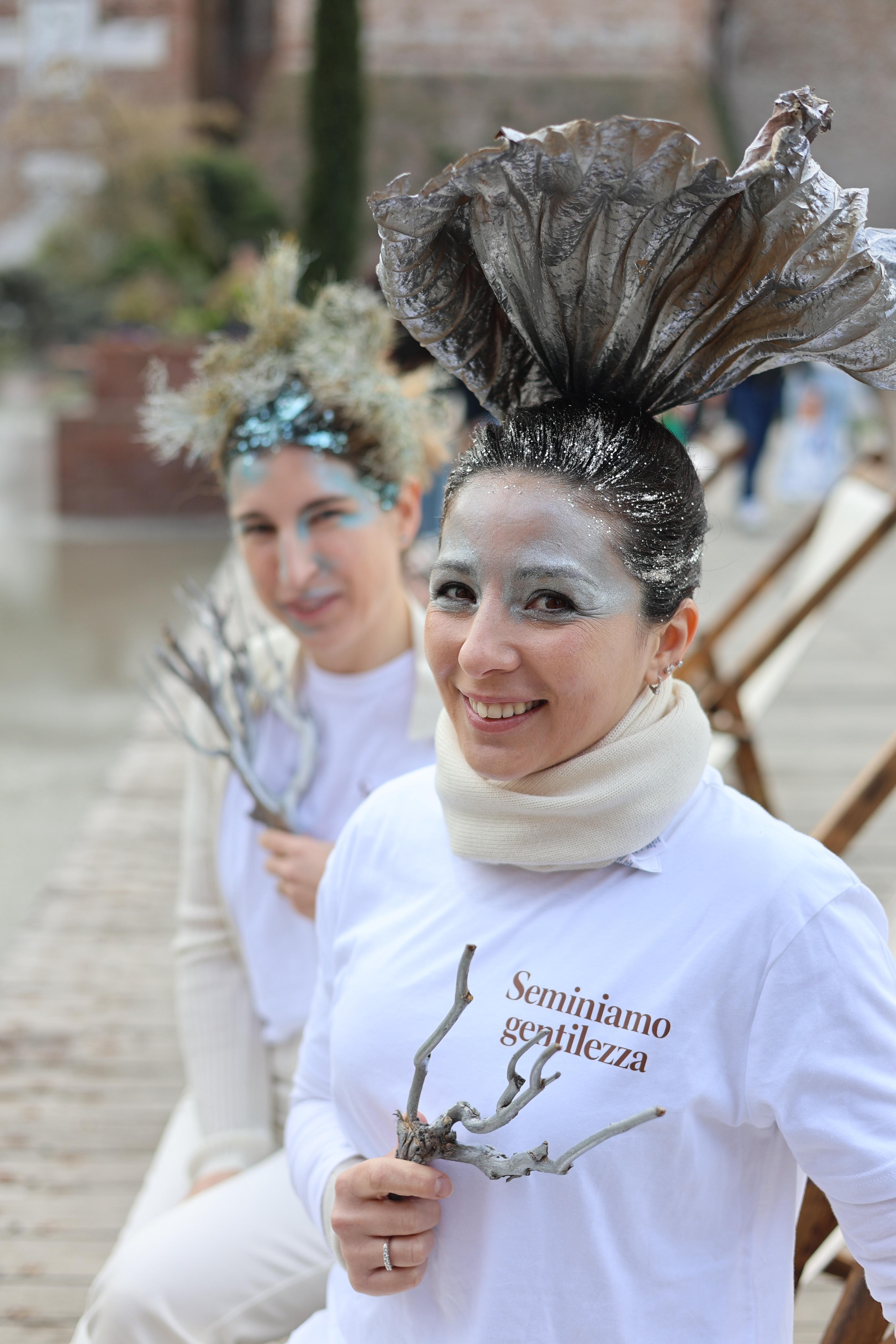 Ad attraversare questo spazio ci sono figure leggere, quasi sospese, che si muovono tra le persone raccogliendo questi gesti silenziosi e restituendoli sotto forma di presenza. La performance finale, curata da Meri e Barbara, è il momento in cui tutto prende corpo.